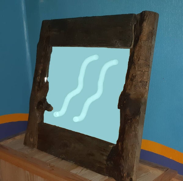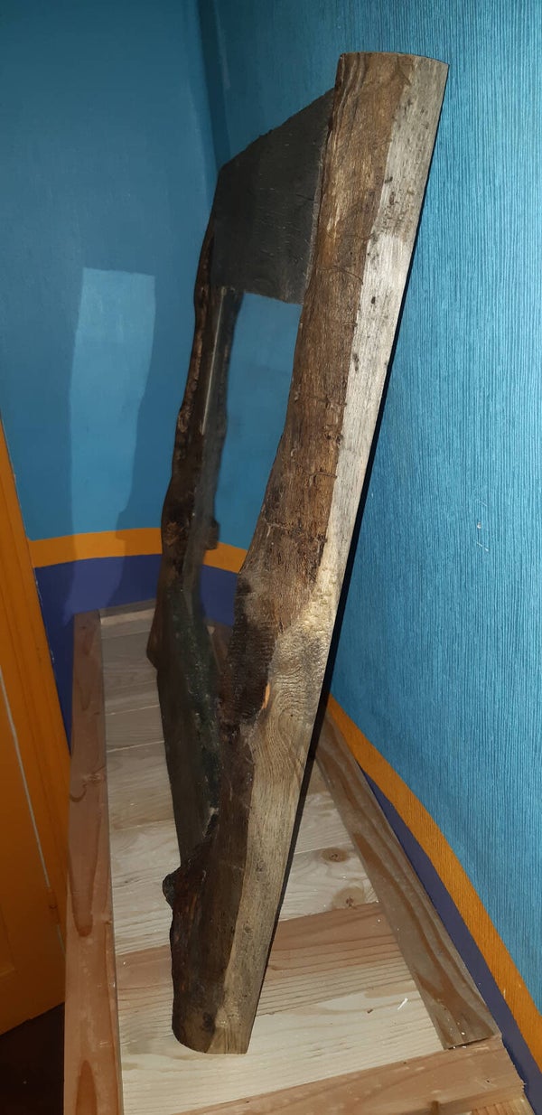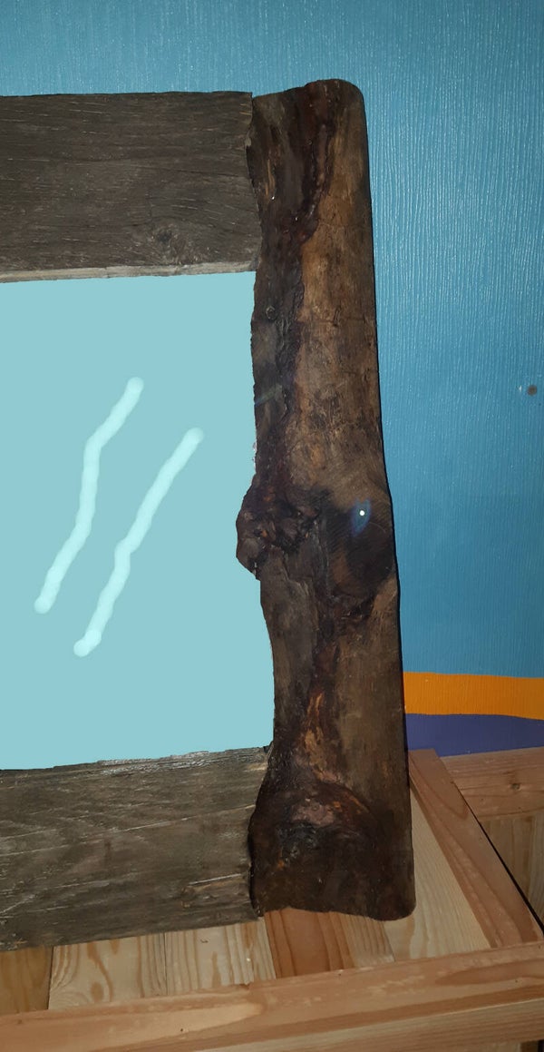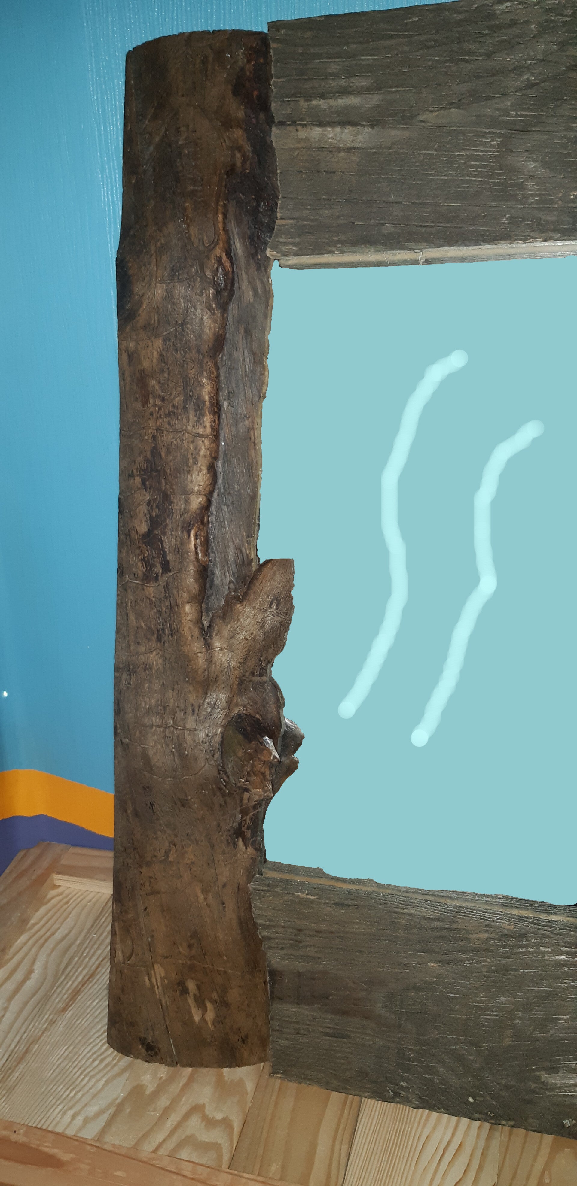Ce miroir a un cadre composé de planches venant d'une clôture pour chevaux ayant plus de 10 ans de vie extérieure aussi nous y trouvons des fissures, un grisé et des lichens attestant de la pureté de l'air à La Chaise-Dieu. Il est aussi composé de bois de dosse ayant une histoire particulière. En effet nous pouvons voir que le résineux dont les dosses sont issues est un arbre qui a été blessé à plusieurs reprises. Cet arbre devait être un arbre d'appui pour le débardage, ce sont des arbres en bordure ou au croisement de chemins forestiers qui permettent de prendre appui pour prendre un virage. Ce sont souvent les plus vieux arbres car l'exploitant les laisse entre chaque plantation. Ce miroir est un hommage à ces arbres-outils souvent centenaires qui ont rendu bien des services à l'humain.