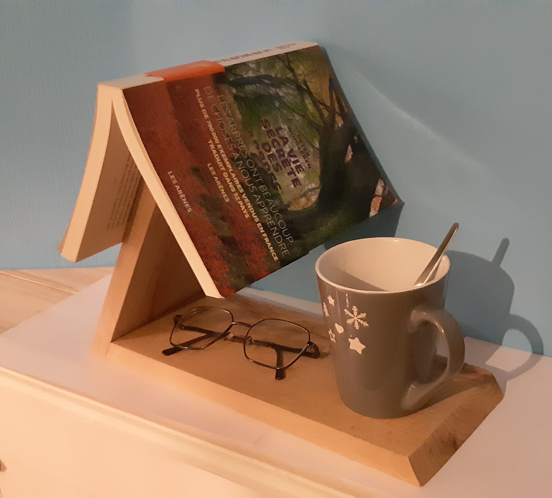 Support de livre. Ce support permet de garder votre page, poser votre tasse et éventuellement une paire de lunette.